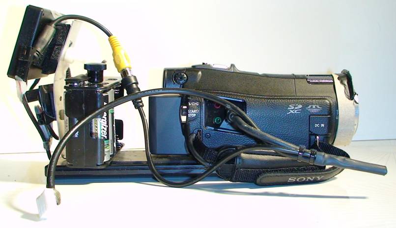 2008 hdr-hc9 (PHASE1) Mini-dv HiDef HDV format. (meg2) Much better daylight clarity, better low light,. Attached a heavy wide angle lens to camera. Housing circuit boards were modified by me to assign a button to take still pictures. See phase1. Added small LCD monitor to rear of tray to be visible from rear of housing.